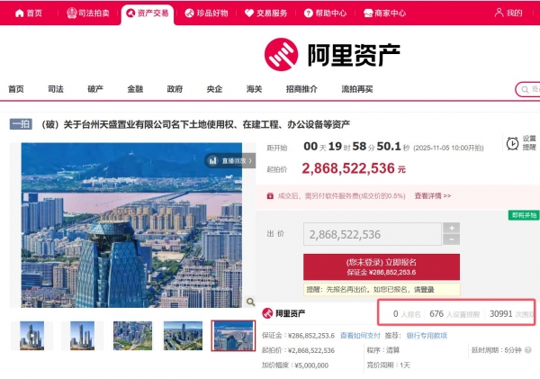 据阿里资产·司法拍卖平台,浙江台州天盛置业有限公司名下位于浙江省台州市的相关资产,将于11月5日被拍卖。据拍卖平台信息,本次被拍资产为天盛公司名下"天盛中心""购物公园"土地使用权、在建工程、办公设备、应收账款等,起拍价约28.685亿元。