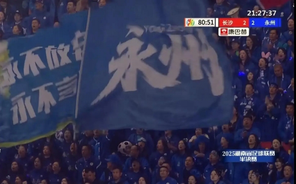 这一场是湘超联赛的半决赛,赛前被看作是名气大的长沙队对上基层球队永州队的较量。长沙常规赛一场未败,被外界贴上了"霸主"标签。永州则被贴上了"黑马"标签,他们本赛季一路走来并不被看好,但也因此吸引了大量目光。赛前永州有不少困难,主教练黄楚儒被禁赛,几名重要球员,包括被称作"带刀后卫"的唐梓铨也因停赛不能上场,人员很不齐整。但他们带着赛季口号"永冲锋"来到长沙之外的球场。永州球迷没有缺席,永州体育中心二转播现场被蓝色的应援覆盖,成千上万球迷用旗帜和口号为球队加油,现场呐喊声甚至传到了长沙赛场。