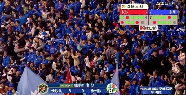 点球大战足足打了九轮。前五轮过后,双方各进四球,比分为4:4,第六轮双方都未进球,可能是射失了或者被对方门将扑出,第七轮和第八轮,双方都顺利罚进,比分罚进,永州在点球大战中以7:6取胜,加上之前常规时间2:2的比分,永州最终以9:8的总比分取胜。现场反应很明显,永州一方发出大声的庆祝声,球员互相拥抱,长沙队在主场感到失望。