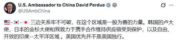 就此次会晤,庞德伟11月25日在X网站发文称:"三边关系牢不可破,在这个区域是一股为善的力量。韩国的卢大使,日本的金杉大使和我致力于携手合作维持供应链受到保护,以及自由、开放的印度-太平洋区域 。美国优先并不是美国独行。"
