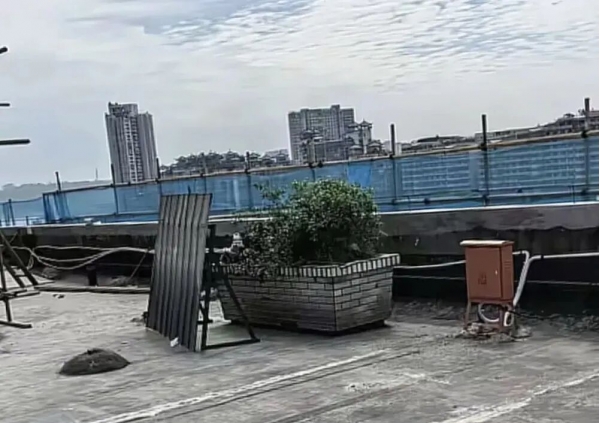 早上7点,岸边服装批发商城的天台上,工人敲开入口附近的一座花坛,瓷砖剥落,土块露出来,还保持着花坛的形状。