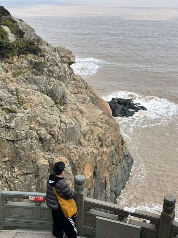 黄平带着母亲的遗像看海。受访者供图