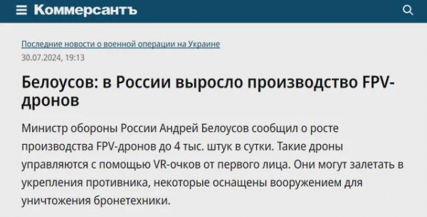 此时,别洛乌索夫的表态就泄露了其中的秘密。原来,俄之所以能够在短时间里,实现FPV产量翻四倍,主要原因是,俄通过战时体制和军民结合的方式,找到了一条扩大FPV生产规模的捷径。