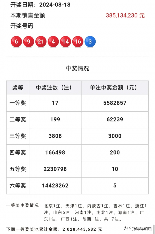 大家好,今天是8月18日,星期日,双色球第24095期的开奖结果已经公布,本期一等奖17注,分落12省。