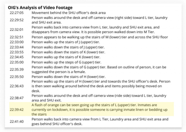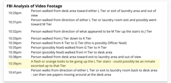 联邦调查局的观看记录将这一模糊影像描述为 "疑似一名囚犯":"有一道橙色光影疑似正走上L监区的楼梯。这有可能是一名囚犯被押送前往该监区。"