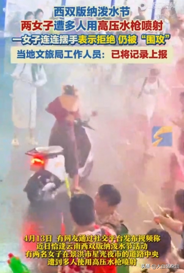 4月13日,有网友爆料,有两名女子在景洪市星光夜的道路中央,遭到了多人使用高压水枪喷射,即便对方极力拒绝,仍然被遭到围攻。