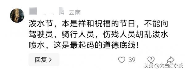 也有当地网友表示,泼水活动是为了表达祝福,当地人都有分寸,不会对骑车的人进行泼水,以免发生危险,而对女性泼水通常很温柔,不会像视频中那些人那么粗俗粗暴,不排除存在故意骚扰嫌疑。