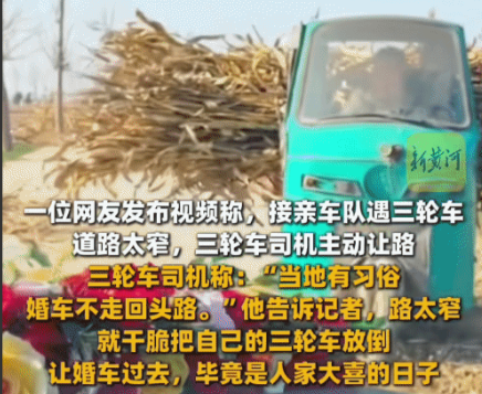 而且他们当地有习俗,那就是"婚车不走回头路",于是他就下车,把自己三轮车推翻到路旁,把路让出来,让婚车通过。