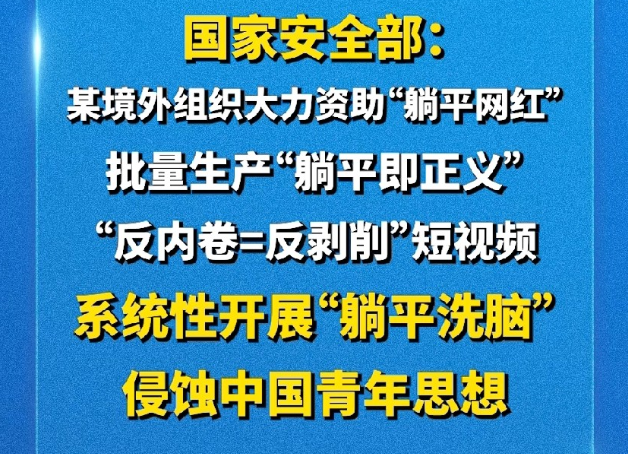 4月28日,国家安全部这一重磅披露,揭开了"躺平"热潮背后令人不寒而栗的真相。国家安全机关工作发现,某境外组织大力资助"躺平网红",批量生产鼓吹消极价值观的短视频,系统性开展"躺平洗脑"。不仅如此,该组织还资助各类反华媒体和智库,炮制"奋斗=被剥削"、"阶层固化=努力无用"等叙事。说到底,这是一场有组织、有策划的意识形态渗透,目标直指中国青年的奋斗信念。