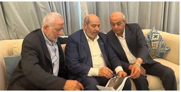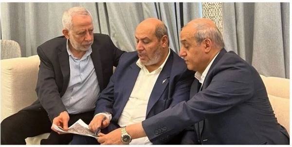 会谈现场照片显示,哈马斯领导人、谈判代表团团长哈利勒·海亚,与"杰哈德"副领导人穆罕默德·欣迪、"人阵"副领导人贾米勒·马兹赫尔,齐聚埃及的沙姆沙伊赫,就详细标明以色列从加沙分阶段撤军的地图展开磋商。