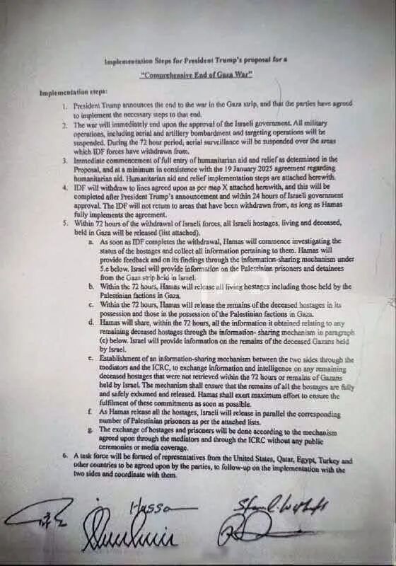 协议虽仅公布第一阶段,但其背后是包含"哈马斯解除武装""加沙由技术官僚委员会过渡管理""最终移交巴勒斯坦权力机构"等20项条款的完整方案。