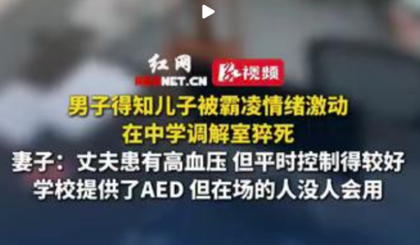 下午5时许,她和丈夫进入通泉中学,"进校后我们得知儿子从这个学期一开始就被其他同学索要零食,之后被索要钱财,3月30日下午被同学殴打。我们家只有这一个孩子,他爸爸知道孩子被欺凌的经过后情绪很激动,从学校操场进入调解室,调解没几分钟他人就没有了。"李女士称,丈夫出事后,学校的工作人员提供了AED,但在场的人没有人会使用,拨打120急救电话后,急救人员通过电话教她心肺复苏,几分钟后,120急救人员赶到现场,经诊断,丈夫已经死亡。事发至今,李女士认为此事没有得到妥善解决,其丈夫的遗体也还没有安葬。