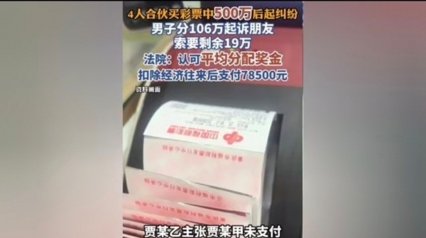 事情是这样的:贾某甲建了个微信群,把贾某乙和另外两个朋友拉进来,几个人经常一起凑钱买彩票,钱平摊,中了奖也平分。去年7月,他们花140元买的双色球,真中了507万多!贾某甲把奖金领回来后,给贾某乙转了106万。