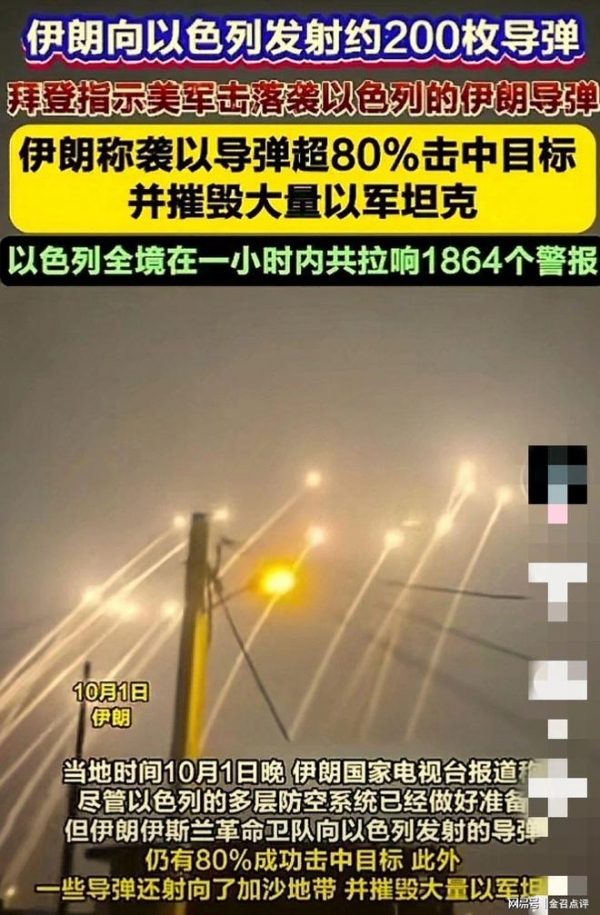 报复第一件事就是内衣先把自己转移到安全地带,然后才指挥革命卫队向以色列发射导弹。10月1日晚上,将近200枚导弹呼啸着向以飞去。而平头哥要已提前收到美帝的情报,数百万人早已进入防空洞。