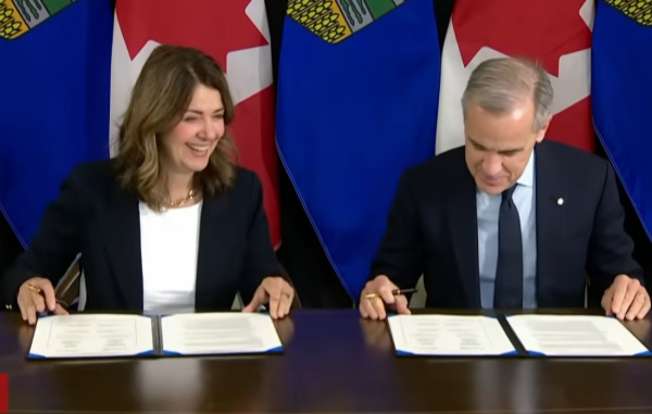 2025年11月,加拿大总理卡尼(右)与阿尔伯塔省省长就修建输油管道签署协议 视频截图