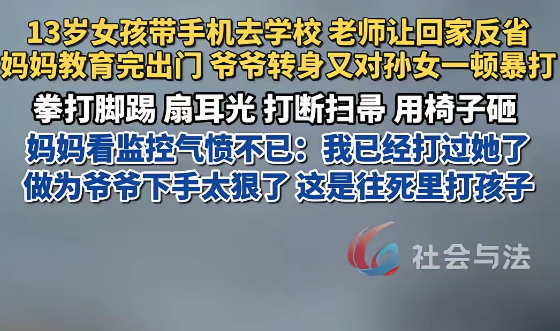 最近,河南发生了一起家庭暴力事件:一名13岁女孩因带手机去学校被老师要求回家反省。母亲得知后已对女儿进行了批评教育,但随后女孩的爷爷竟对孙女实施了极其严重的殴打。