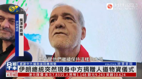 据凤凰卫视报道,当地时间4月15日,伊朗总统佩泽希齐扬突然现身伊朗红新月会总部,出席中国向伊朗捐赠人道主义物资的交接仪式,并特别向中国政府和中国人民表达感谢。
