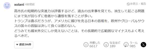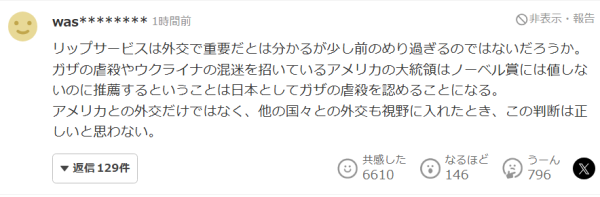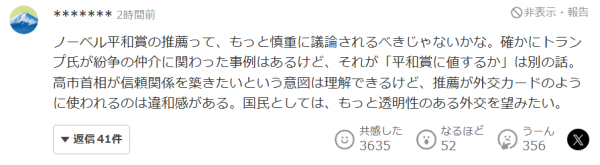 也有网民对高市早苗总体上表示理解,但也反对推荐特朗普参评诺贝尔奖:"我理解高市首相希望建立信任,但我对这种将推荐用作外交手段的做法感到不安。"