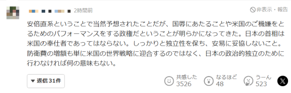 有网友的评论则近乎是"直球开骂":"不愧是安倍嫡系,这届政府明显是在羞辱国家,并为了讨好美国而作秀。日本首相不应该成为美国的奴仆。他必须保持独立,不能轻易妥协。除非是为了日本的政治独立,而不是为了迎合美国的全球战略,否则增加国防开支将毫无意义。"