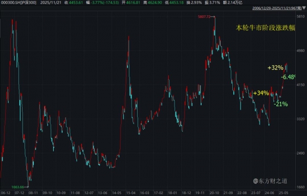 下面再补一张本轮牛市以来的阶段涨跌幅,其中4月份由于关税大利空,下跌幅度达21%,当然这也是今年以来最佳的买入机会。