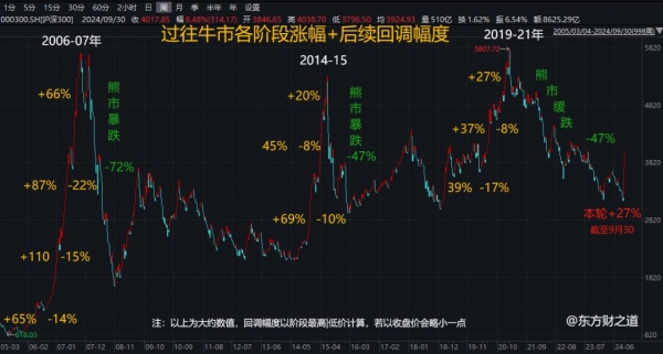 下图这张图截至去年9月30日,在近一年中多次提及,展现了过去几轮牛市中,上涨阶段和后续的回调幅度: