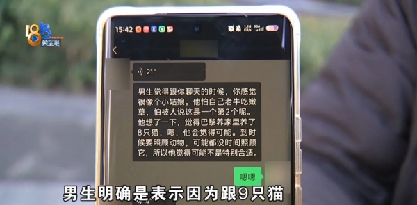 杭州邂逅信息技术服务有限公司 工作人员:因为她跟男生说,她是跟几只猫睡在一张床上,所以男生觉得这个有点夸张。