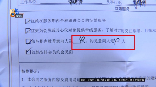小徐:我没有仔细看。口头承诺和合同上的完全不一样,但我肯定是奔着他们口头承诺去的。当时说的是一周可以约见2到3个男生,一共服务周期是4个月,那我就想大概可以见30个男孩子。我的诉求是我愿意支付这个违约金,但是这个人数(费用)我不愿意支付。