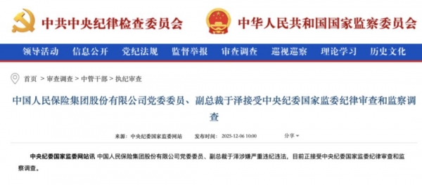 12月6日,据中央纪委国家监委网站通报,中国人民保险集团股份有限公司(下称"中国人保集团",601319.SH,1339.HK)党委委员、副总裁于泽涉嫌严重违纪违法,目前正接受中央纪委国家监委纪律审查和监察调查。