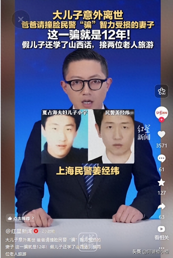 镜头里说话的是个上海的年轻民警,叫姜经纬,就这一眼,夏占海的眼睛都直了,这民警的脸,跟自己去世的儿子梁宇,简直是一个模子刻出来的。