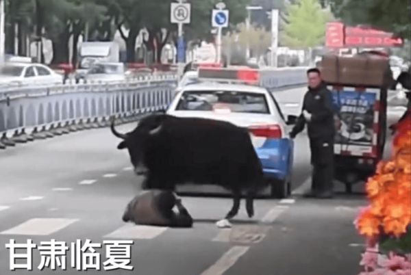 10月17日,甘肃临夏一头牛跑上街道后将一名行人顶翻,行人沿斑马线过马路,牛将行人顶翻后继续在路中奔跑,当地警方疏散周围人员后进行围捕,十余名民警和牛主人合力将牛控制。