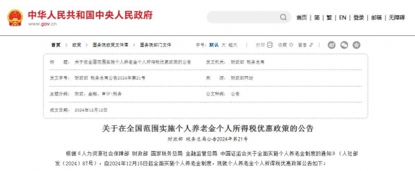 此前,财政部、税务总局联合印发《关于在全国范围实施个人养老金个人所得税优惠政策的公告》。