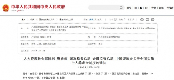 同时,财政部、税务总局联合印发《关于在全国范围实施个人养老金个人所得税优惠政策的公告》。