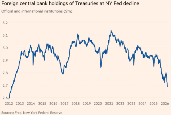 各国央行在美国纽约联储托管的美债规模降低 《金融时报》报道截图