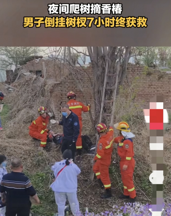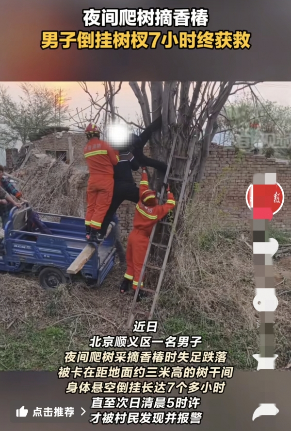 最近顺义有个小伙子晚上22点去树上摘香椿时失足摔落,左小腿被树干夹住,导致无法自行脱困,导致整个人悬挂在半空整整七个多小时,当被救下时身体已全麻痹。这大晚上的树这么高,真是玩命。春天大家都想尝鲜,但太不值当,看着都后怕。