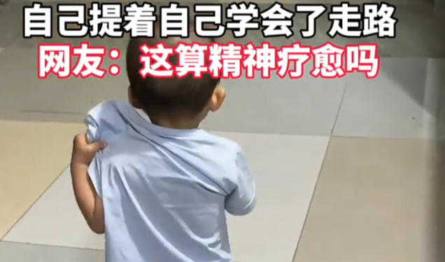 这就是精神支柱的力量吗?广西,一位小宝宝在家里学走路,因为自己还走不明白,家长就在后面拉着衣领,结果走着走着,家长突然松开手,小宝宝全然不知,就提着自己往前走,这也让不少家长想起自己孩子第一次走路的样子。
