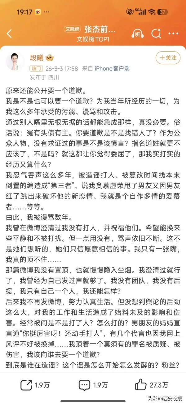 段曦在长文中细数过往,坦言自己在张杰事业低谷时不离不弃,卖掉成都车房奔赴上海陪伴,甚至靠夜场打工支撑对方的音乐梦想。她直言自己是真真实实被出轨、被分手,两人尚未正式分手时,张杰的感情便已出现新动向。同时,段曦澄清了流传多年的"后台掌掴谢娜"谣言,称这一不实传闻让她遭受十余年网暴,事业受损、生活被扰,而张杰夫妇从未出面为她澄清半句。字里行间,满是多年的委屈与不甘。