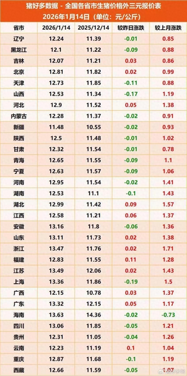 这两天养猪的朋友都在问同一个问题,猪价是不是涨到头了?刚看到点起色,怎么突然就涨不动了?1月14号全国生猪均价12块6毛8,比昨天就跌了1分钱,但这1分钱的背后,可是19个省市都在跌价,这场面可不算小。