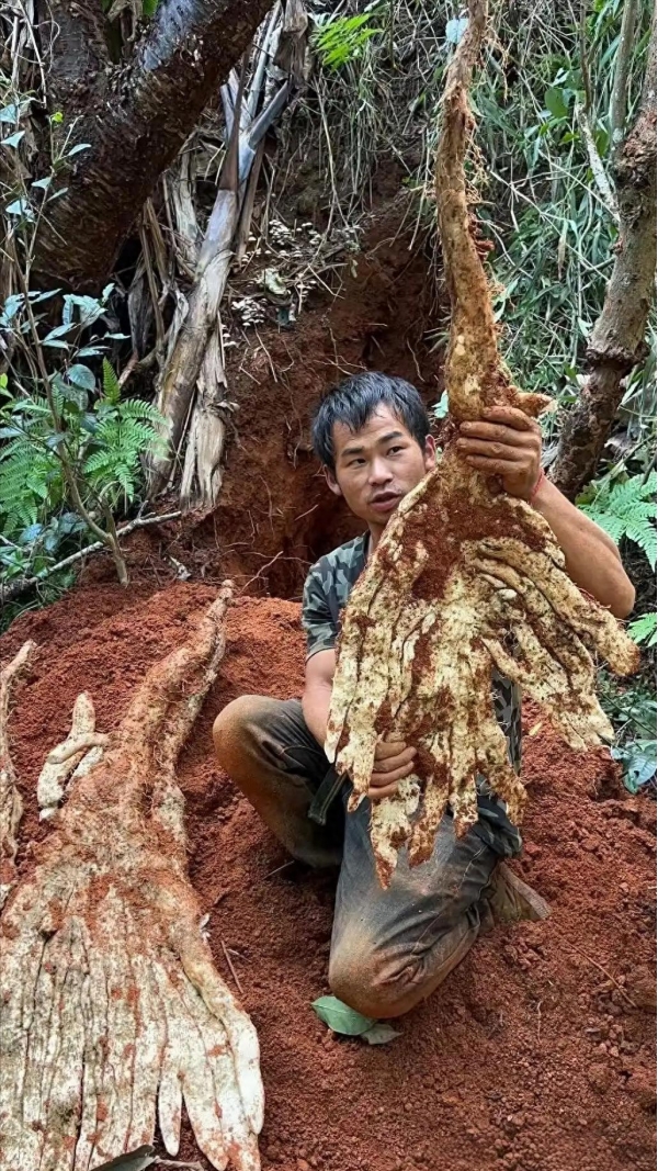 原来,当事人陈先生祖祖辈辈都在山里生活,挖山货是他的日常。当天,他像往常一样进山,本想着挖点普通野山药,没想到一锄头下去,触感异常坚硬。扒开土一看,根茎粗得像拳头,顺着往下挖却看不到头,陈先生意识到,自己遇上 "大货" 了。