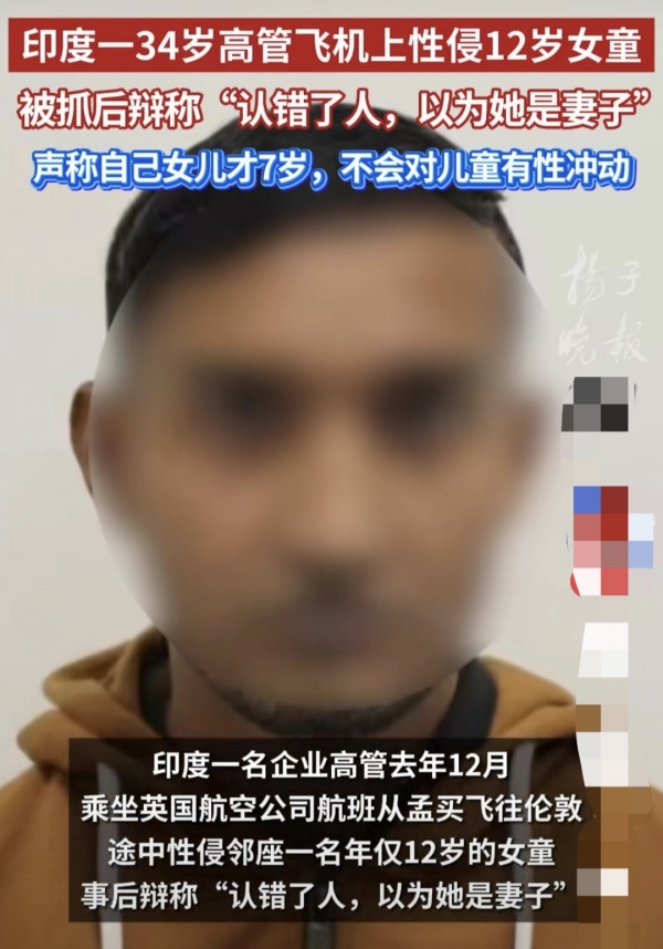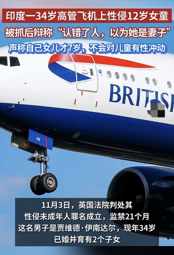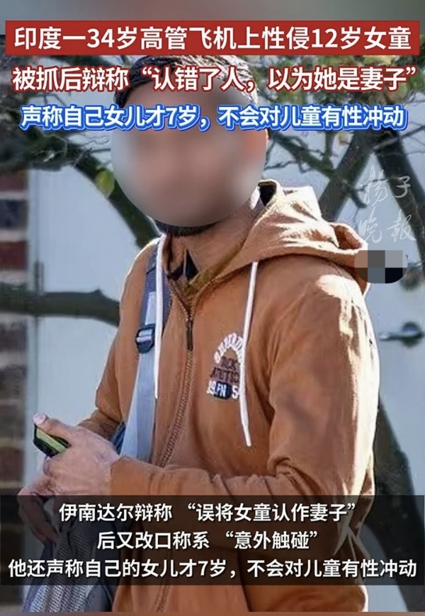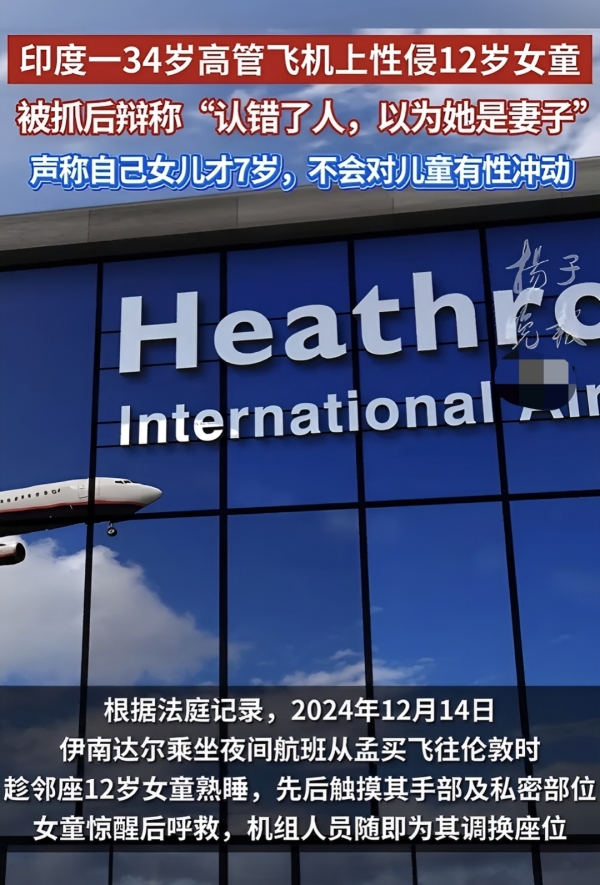 "误把女童当妻子?"飞机上性侵12岁女孩,印度高管荒唐借口震惊英国法庭!