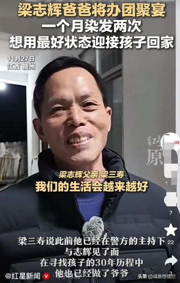 今年10月28日,梁爸爸和儿子Dna比对成功,他就告诉网友,要以全新的面貌等志辉归来,这一天,他等了30年。