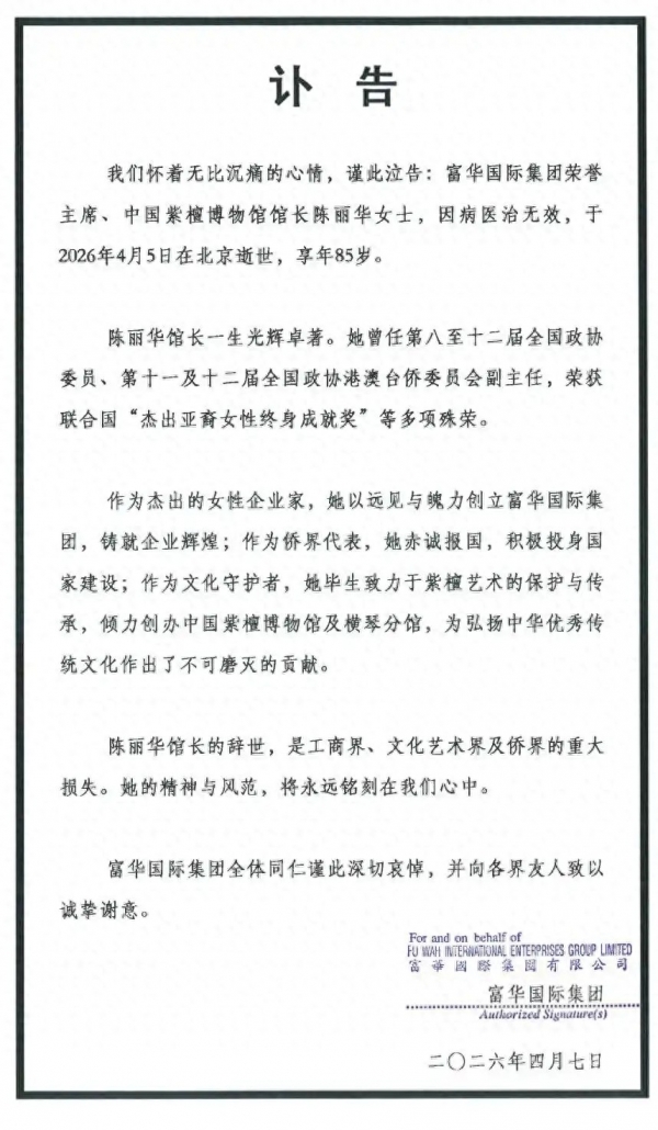 4月7日,富华国际集团发布讣告称,陈丽华女士因病医治无效,于2026年4月5日在北京逝世,享年85岁。