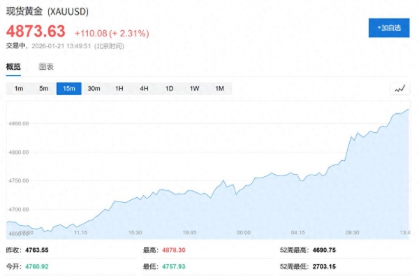 受地缘政治局势升级影响,全球金融市场避险情绪急剧升温。周三,现货黄金价格飙升逾2%,突破每盎司4870美元,创下历史新高。