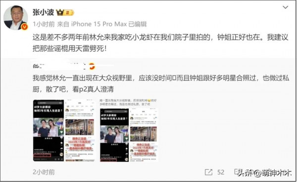 随后,北京凤凰联动文化传媒总裁张小波转发澄清文为林允澄清,称照片拍摄于两年前,地点是在他家院子里,当时林允到家里吃小龙虾,月嫂钟姐也在,建议谣棍被天雷劈死。