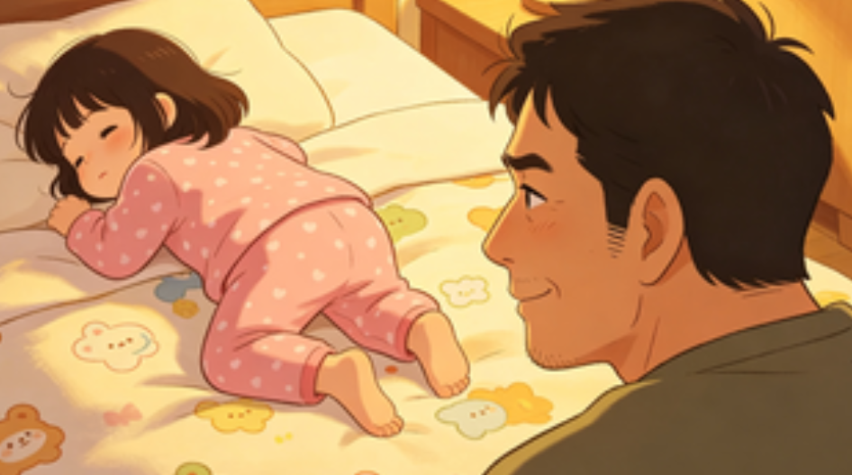 画面中,小女孩躺在床上进入熟睡状态,身旁的爸爸安静陪伴。孩子睡姿十分放飞,全程背对爸爸,高高撅起小屁股,精准对着爸爸的方向,姿势呆萌又随性。孩童睡觉本就好动,翻身扭动都是常态,毫无防备的小家伙完全没有察觉自己的可爱模样。