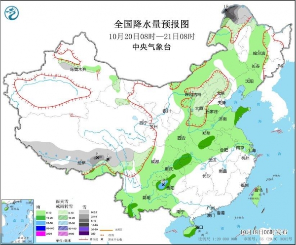在这股冷空气的影响下,我国北方多地也将迎来降雪天气。预报显示,19日,新疆西北部和北疆东部、西藏南部和东部、青海中东部、甘肃河西、川西高原等地将出现小到中雪或雨夹雪。其中,新疆和北疆、青海、甘肃等地的部分地区降雪量较大,可达10~15毫米的暴雪级别。