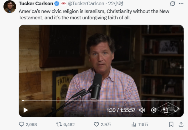 据"今日俄罗斯"(RT)当地时间4月16日报道,美国记者塔克·卡尔森(Tucker Carlson)在社交平台发布视频表示,美国总统特朗普的宗教并非基督教,而是"以色列主义"。