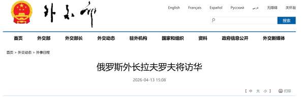 俄罗斯外长拉夫罗夫将访华 2026-04-13 15:30 观察者网 外交部网站13日消息,外交部发言人宣布: 应中共中央政治局委员、外交部长王毅邀请,俄罗斯外长拉夫罗夫将于4月14日至15日对中国进行正式访问。