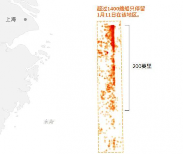 1月11日,约1400艘中国船只突然停止常规捕鱼活动或驶离母港,再次聚集在东海,组成了一个超200英里(约322公里)长的矩形阵型。船舶追踪数据显示,这一阵型非常密集,以至于一些驶近的货船似乎要绕行或不得不"之字形"穿行。