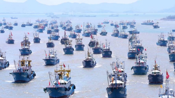 报道援引船舶追踪数据称,最近几周,中国两次悄悄动员数千艘渔船,在东海海域形成巨大浮动屏障。