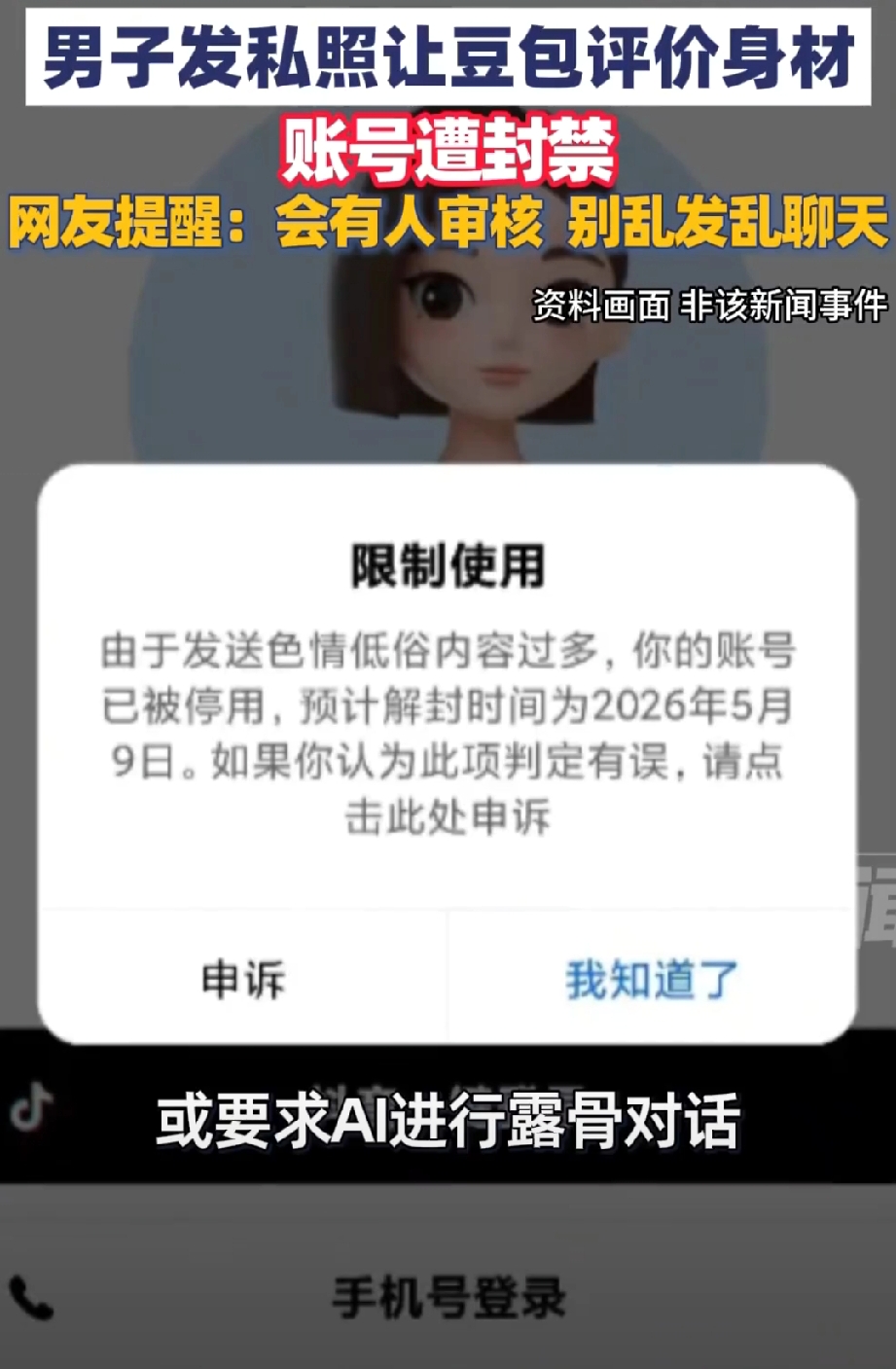 三月底,北京网友拍视频说,他朋友给豆包AI发了一张自拍照,还让系统评价身材,没过多久账号就被永久封停,这事传开之后,评论区有很多人跟帖,有人提到发过类似内容也被封号,还有人反复上传裸照去测试,发现系统一点都没留情,也有人表示不理解,觉得自己发的图片AI根本看不到,它怎么会知道是什么内容。